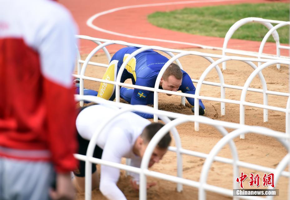 10月23日,第七届世界军人运动会海军五项赛事在湖北省武汉市拉开序幕。图为瑞典男选手赫尔曼松(蓝)和德国选手博格斯挑战隧道障碍。中新社记者 侯宇 摄