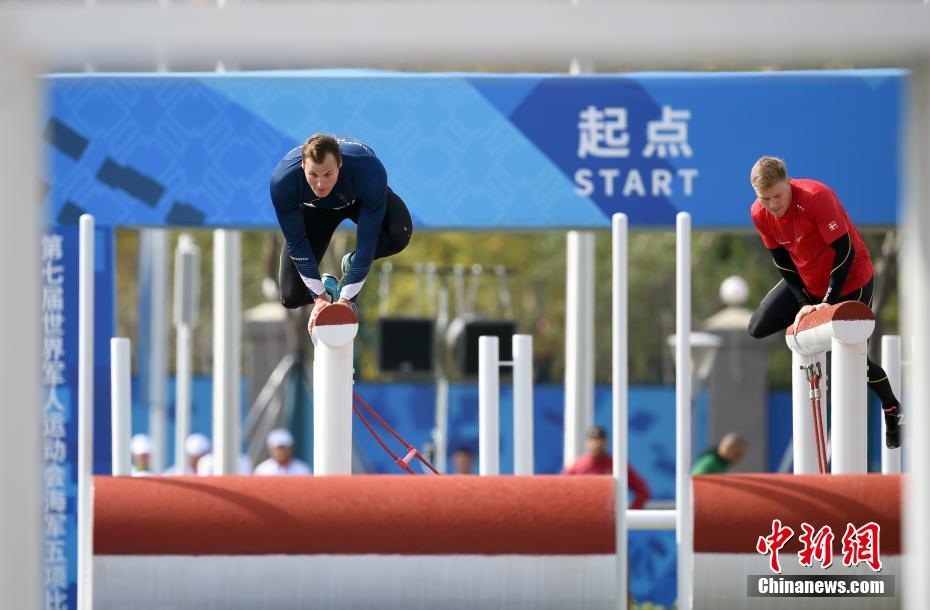 10月23日,第七届世界军人运动会海军五项赛事在湖北省武汉市拉开序幕。图为芬兰男选手库伊瓦莱宁(左)和丹麦男选手伦德挑战平衡木障碍。中新社记者 侯宇 摄