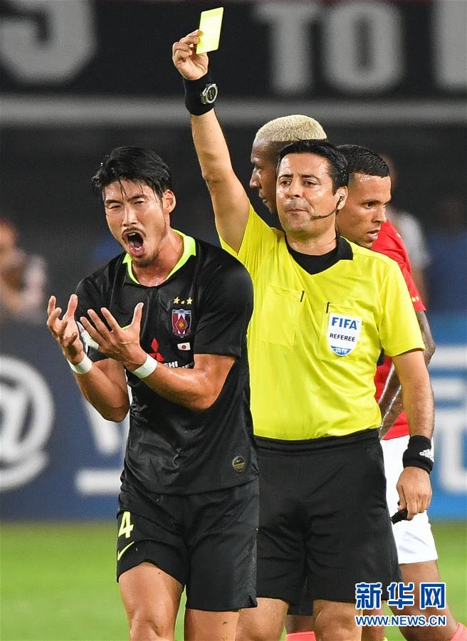 10月23日,主裁判阿里雷扎·法加尼在比赛中向浦和红钻队球员铃木大辅(左)出示黄牌。 当日,在广州举行的2019年亚冠联赛半决赛次回合比赛中,中国广州恒大队主场以0比1不敌日本浦和红钻队,从而以两回合0比3的总比分无缘决赛。 新华社记者刘大伟摄