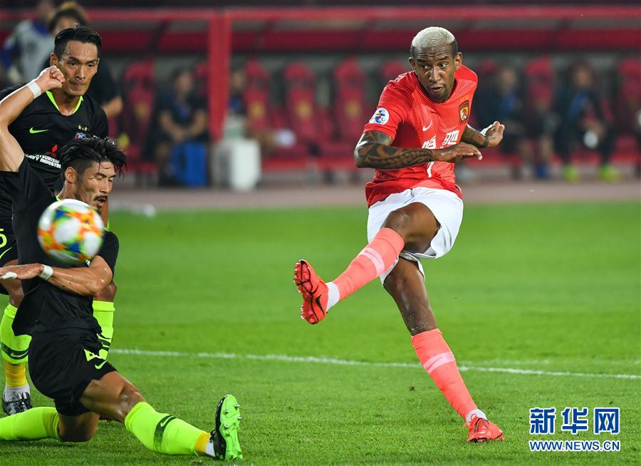 10月23日,广州恒大队球员塔利斯卡(右)在比赛中射门。 当日,在广州举行的2019年亚冠联赛半决赛次回合比赛中,中国广州恒大队主场以0比1不敌日本浦和红钻队,从而以两回合0比3的总比分无缘决赛。 新华社记者刘大伟摄