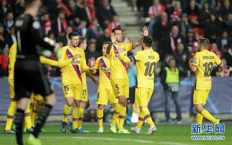 10月23日,巴塞罗那队球员在布拉格斯拉维亚队球员奥莱因卡打入乌龙球后庆祝。 当日,在2019-2020赛季欧洲足球冠军联赛F组比赛中,西甲巴塞罗那队客场以2比1战胜捷克布拉格斯拉维亚队。 新华社/路透
