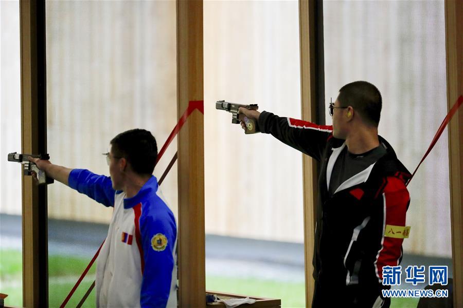 10月23日,中国队选手姚兆楠(右)在比赛中。 当日,在武汉举行的第七届世界军人运动会射击项目男子25米中心发火手枪团体赛中,中国队获得金牌。 新华社记者姜克红摄