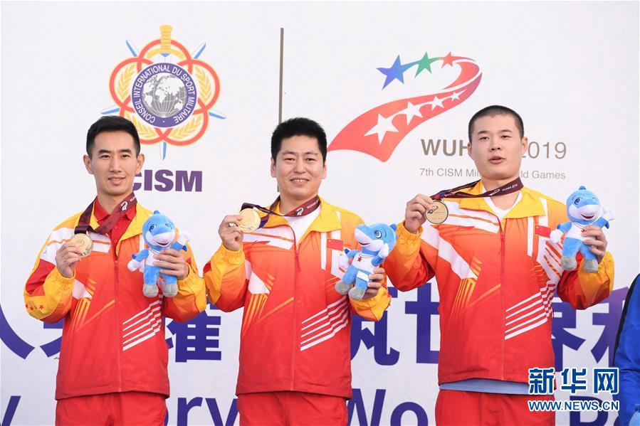 10月23日,中国队选手金泳德(中)、高铮(左)、姚兆楠在颁奖仪式上。 当日,在武汉举行的第七届世界军人运动会射击项目男子25米中心发火手枪团体赛中,中国队获得金牌。 新华社记者姜克红摄