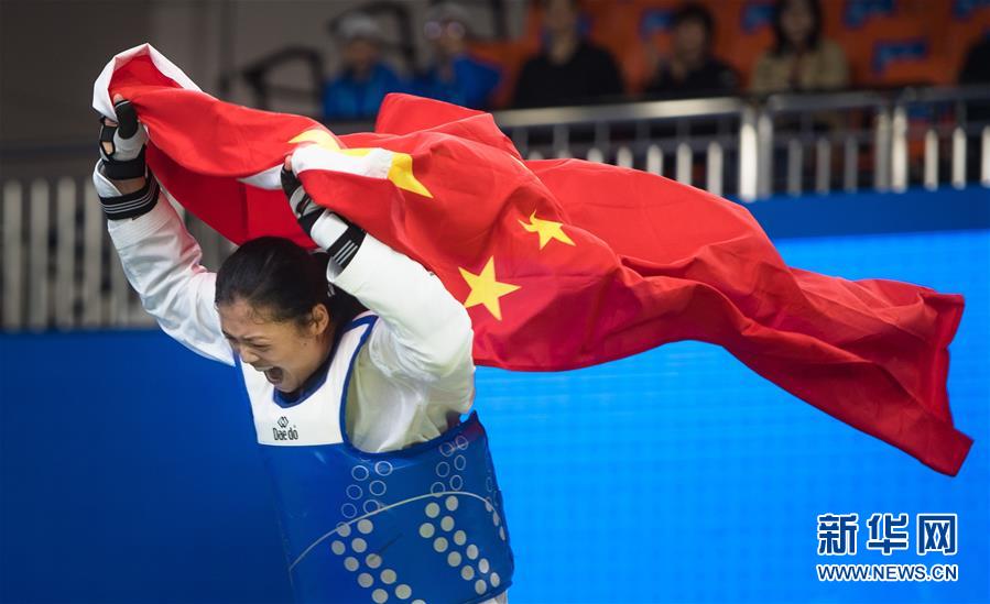 10月23日,中国选手李晨在赛后庆祝。 当日,在武汉举行的第七届世界军人运动会跆拳道女子73公斤级决赛中,中国选手李晨战胜德国选手玛丽亚,夺得冠军。 新华社记者肖艺九摄