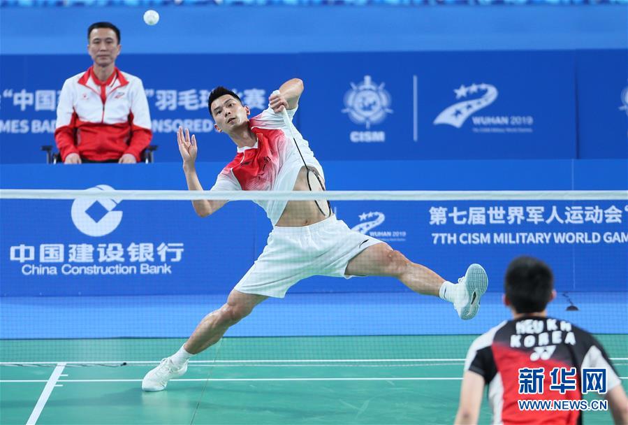 10月23日,中国队选手赵俊鹏(中)在比赛中回球。 当日,在武汉进行的第七届世界军人运动会羽毛球男子团体比赛中,中国队以5比0战胜韩国队,夺得冠军。 新华社记者侯俊摄