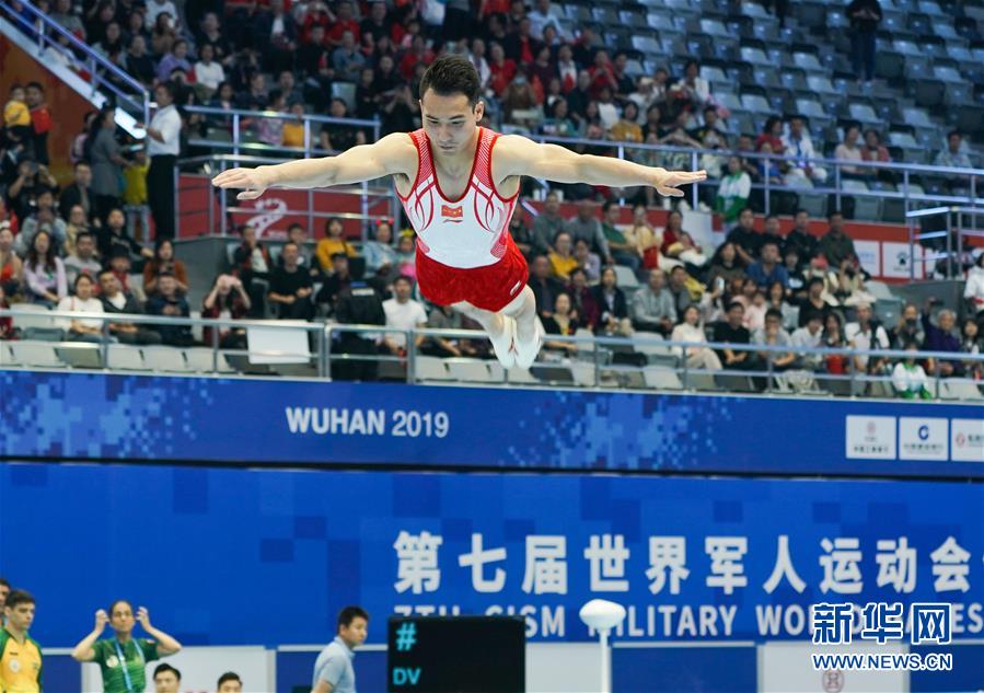 10月21日,中国选手邓书弟在自由操比赛中。 当日,在武汉举行的第七届世界军人运动会体操项目男子团体决赛中,中国队获得冠军。 新华社记者 潘思危 摄