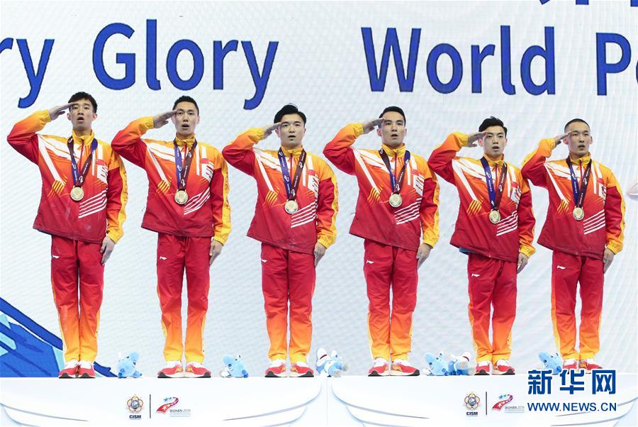 10月21日,中国队选手在颁奖仪式上。 当日,在武汉举行的第七届世界军人运动会体操项目男子团体决赛中,中国队获得冠军。 新华社记者 潘思危 摄