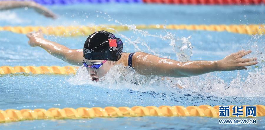 10月23日,中国队选手张雨霏在比赛中。 当日,在武汉进行的第七届世界军人运动会男女4×100米混合泳接力决赛中,由闫子贝、李广源、杨浚瑄和张雨霏组成的中国队以3分43秒64的成绩夺冠。 新华社记者程敏摄