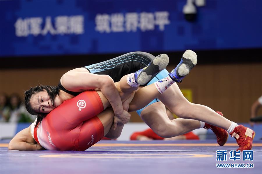10月23日,中国选手周凤(上)在比赛中。 当日,在武汉举行的第七届世界军人运动会女子自由式摔跤68公斤级决赛中,中国选手周凤以6比2战胜波兰选手阿格涅什卡,夺得冠军。 新华社记者金良快摄