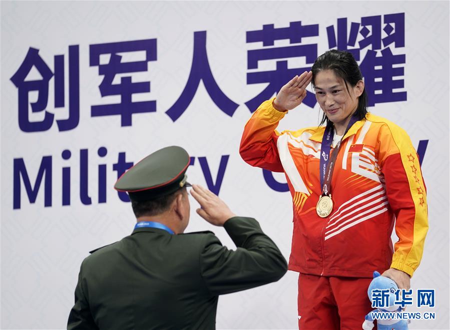 10月23日,中国选手周凤在颁奖仪式上。 当日,在武汉举行的第七届世界军人运动会女子自由式摔跤68公斤级决赛中,中国选手周凤以6比2战胜波兰选手阿格涅什卡,夺得冠军。 新华社记者金良快摄