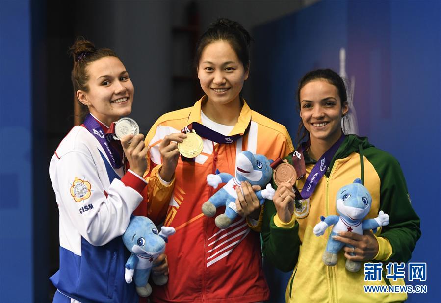 10月23日,冠军中国选手于静瑶(中)、亚军俄罗斯选手玛丽亚(左)和季军巴西选手孔塞桑在颁奖仪式后。 当日,在武汉进行的第七届世界军人运动会女子100米蛙泳决赛中,中国选手于静瑶以1分07秒17的成绩获得冠军。 新华社记者程敏摄