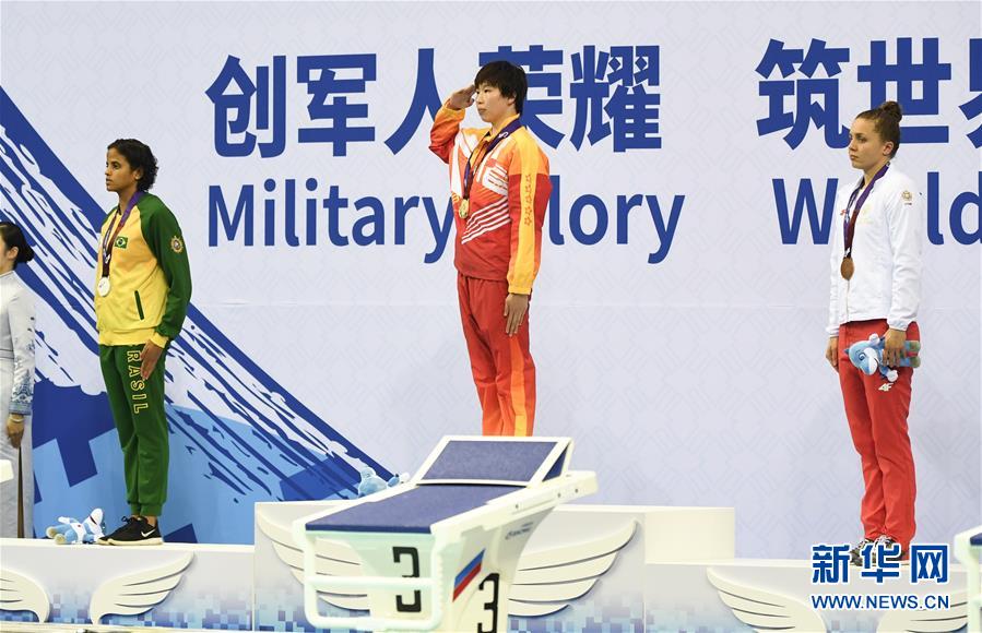 10月23日,冠军中国选手陈洁(中)、亚军巴西选手梅代罗斯(左)和季军波兰选手阿莉恰在颁奖仪式上。 当日,在武汉进行的第七届世界军人运动会女子50米仰泳决赛中,中国选手陈洁以27秒81的成绩获得冠军,中国选手柳雅欣以29秒09的成绩获得第四名。 新华社记者程敏摄
