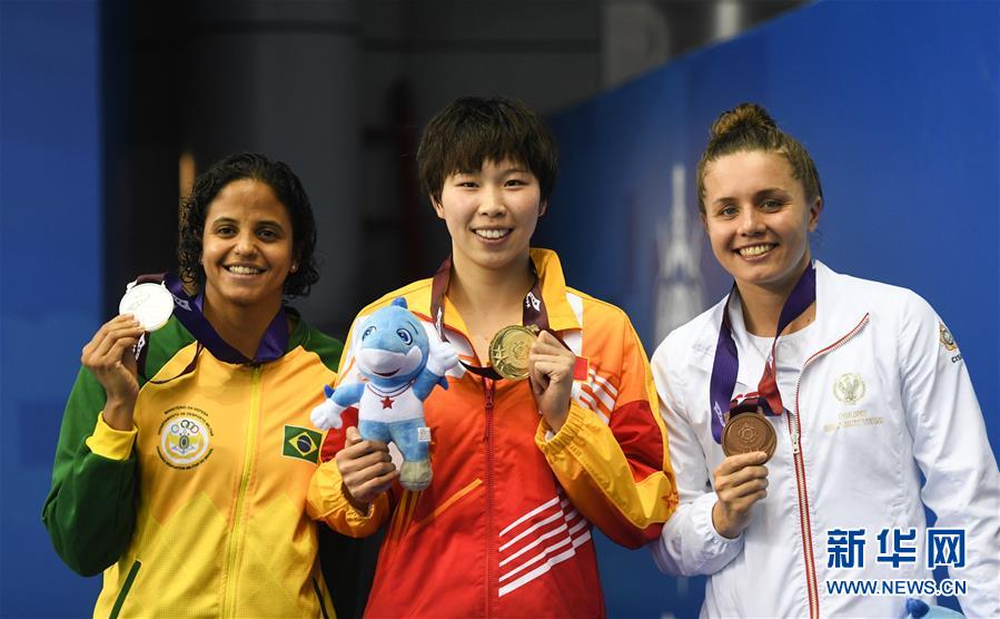10月23日,冠军中国选手陈洁(中)、亚军巴西选手梅代罗斯(左)和季军波兰选手阿莉恰在颁奖仪式上。 当日,在武汉进行的第七届世界军人运动会女子50米仰泳决赛中,中国选手陈洁以27秒81的成绩获得冠军,中国选手柳雅欣以29秒09的成绩获得第四名。 新华社记者程敏摄
