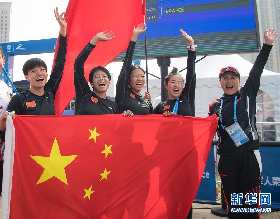 10月24日,中国选手卢嫔嫔、王堂林、管超楠与队友孙洪燕、教练李春梅(由左至右)在赛后庆祝。 当日,在武汉举行的第七届世界军人运动会军事五项女子障碍跑接力决赛中,由管超楠、王堂林、卢嫔嫔组成的中国队以1分55秒34的成绩夺得冠军。 新华社记者肖艺九摄
