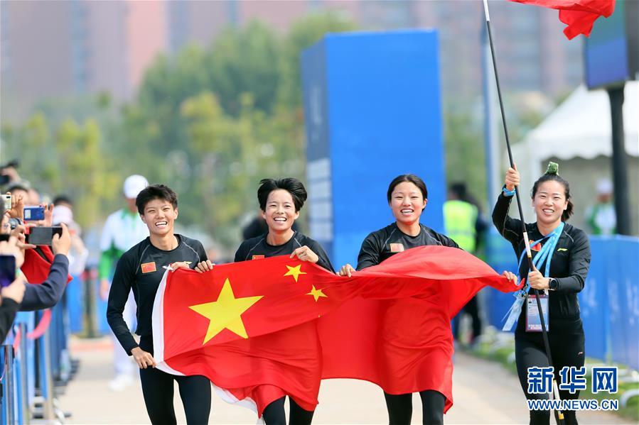 10月24日,中国选手卢嫔嫔、王堂林、管超楠和队友孙洪燕(由左至右)在赛后庆祝。 当日,在武汉举行的第七届世界军人运动会军事五项女子障碍跑接力决赛中,由管超楠、王堂林、卢嫔嫔组成的中国队以1分55秒34的成绩夺得冠军。 新华社记者侯俊摄