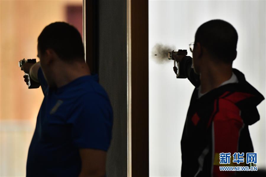 10月24日,中国队选手姚兆楠(右)、乌克兰选手帕夫洛在争夺第一名的决赛中。 当日,在武汉举行的第七届世界军人运动会射击项目男子25米中心发火手枪个人赛中,中国队选手姚兆楠获得银牌。 新华社记者姜克红摄