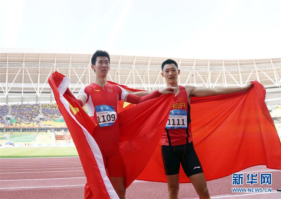 10月24日,中国选手王嘉男(右)、黄常洲在比赛后庆祝。 当日,在武汉举行的第七届世界军人运动会田径项目男子跳远决赛中,中国选手王嘉男、黄常洲分别以8米15和8米12的成绩获得冠亚军。 新华社记者金良快摄
