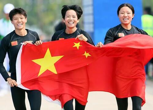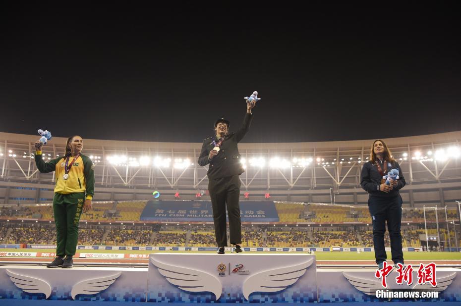 10月24日晚,第七届世界军人运动会女子铁饼决赛在湖北省武汉市举行,中国选手冯彬以64米83夺得冠军。图为中国选手冯彬(中)夺得冠军,巴西选手马丁斯(左)获得亚军,希腊选手阿娜古诺斯托普洛获得第三名。中新社记者 侯宇 摄