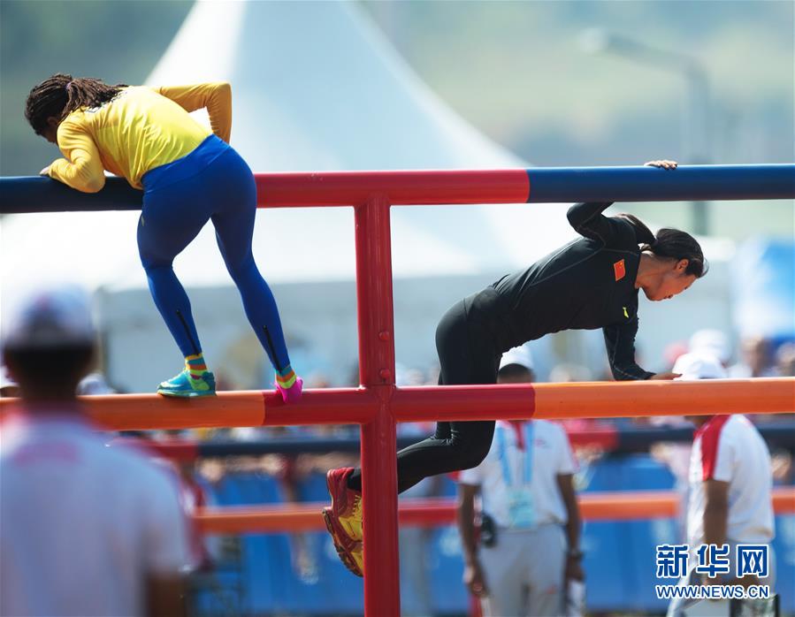 10月24日,中国选手管超楠(右)在比赛中。 当日,在武汉举行的第七届世界军人运动会军事五项女子障碍跑接力决赛中,由管超楠、王堂林、卢嫔嫔组成的中国队以1分55秒34的成绩夺得冠军。 新华社记者肖艺九摄