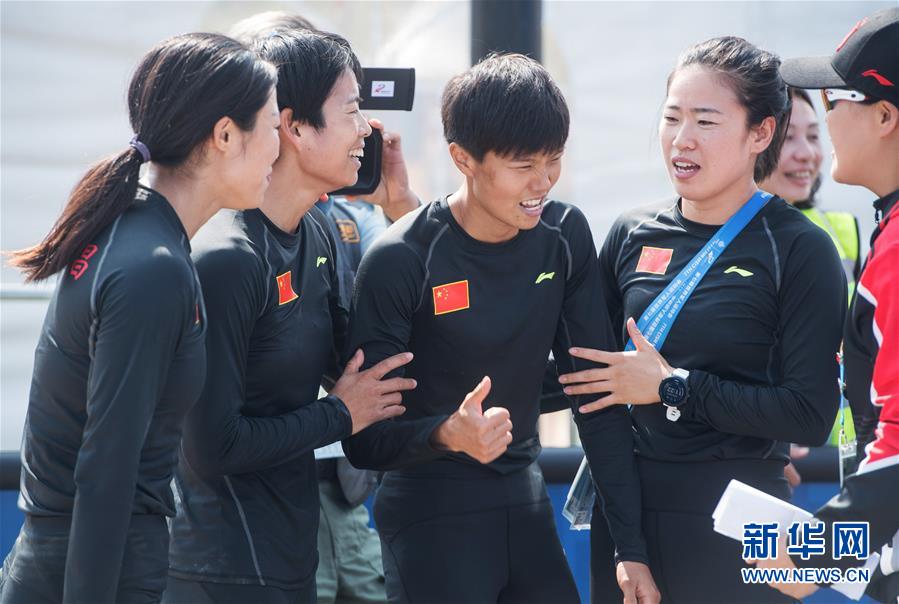 10月24日,中国选手卢嫔嫔(左三)到达终点后与队友庆祝。 当日,在武汉举行的第七届世界军人运动会军事五项女子障碍跑接力决赛中,由管超楠、王堂林、卢嫔嫔组成的中国队以1分55秒34的成绩夺得冠军。 新华社记者肖艺九摄