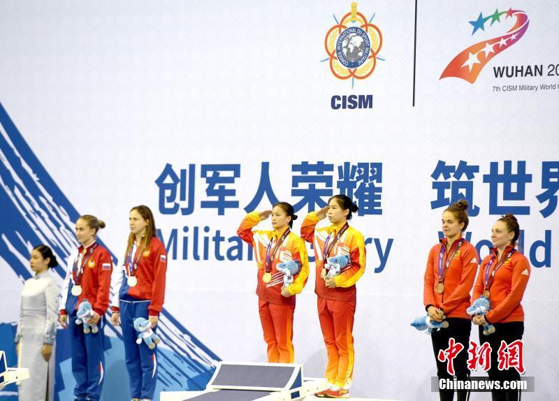 10月24日,第七届世界军人运动会跳水项目在湖北省武汉市举行,中国八一跳水队在跳水项目比赛上斩获3枚金牌。中国八一跳水队员王宗源在男子1米跳板比赛上获得金牌、中国八一跳水队员韦颖、黄小惠在女子双人3米跳板比赛上获得金牌、中国八一跳水队员司雅杰在女子跳台比赛上获得金牌。图为女子双人3米跳板比赛颁奖现场。中新社记者 安源 摄