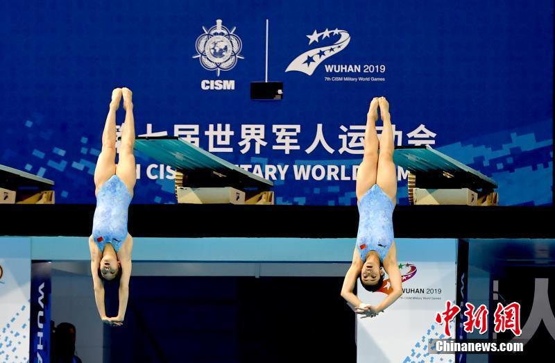 10月24日,第七届世界军人运动会跳水项目在湖北省武汉市举行,中国八一跳水队在跳水项目比赛上斩获3枚金牌。中国八一跳水队员韦颖、黄小惠在女子双人3米跳板比赛上获得金牌。图为双人跳水比赛现场。中新社记者 安源 摄
