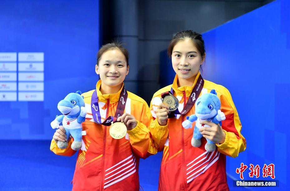 10月24日,第七届世界军人运动会跳水项目在湖北省武汉市举行,中国八一跳水队在跳水项目比赛上斩获3枚金牌。中国八一跳水队员韦颖、黄小惠在女子双人3米跳板比赛上获得金牌。图为中国八一跳水队队员韦颖(左)、黄小惠。中新社记者 安源 摄