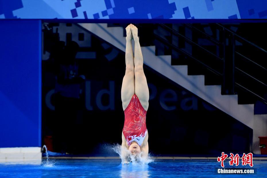 10月24日,第七届世界军人运动会跳水项目在湖北省武汉市举行,中国八一跳水队在跳水项目比赛上斩获3枚金牌。中国八一跳水队员司雅杰在女子跳台比赛上获得金牌。图为中国八一跳水队队员司雅杰在比赛中。中新社记者 安源 摄