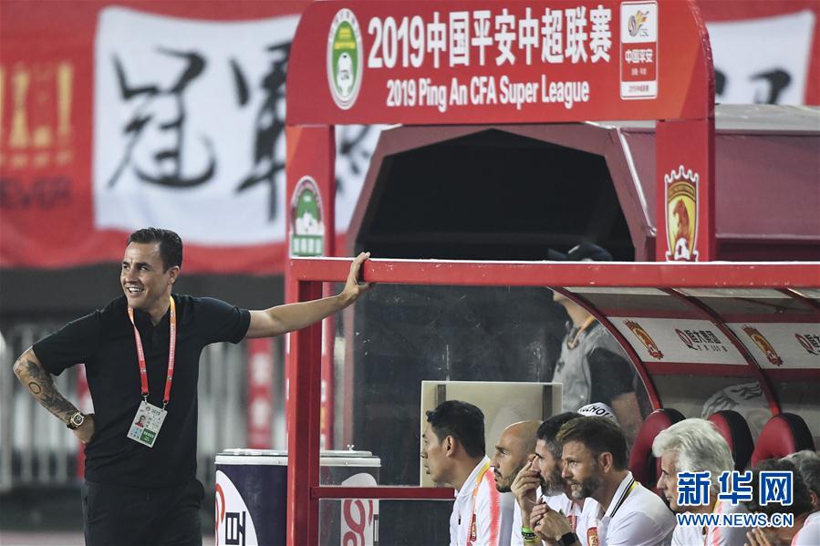 10月27日,广州恒大淘宝队主教练卡纳瓦罗(左一)在比赛场边。 当日,在2019赛季中超联赛第27轮比赛中,广州恒大淘宝队主场以2比2战平河南建业队。 新华社记者 邓华 摄