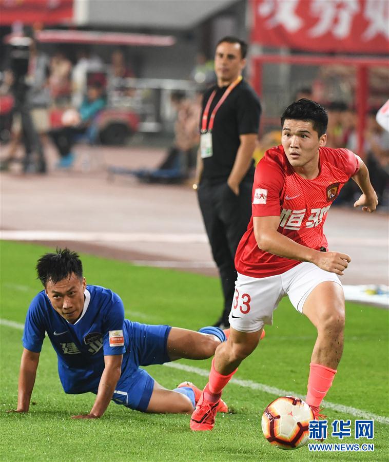 10月27日,广州恒大淘宝队球员钟义浩(右)在比赛中带球进攻。 当日,在2019赛季中超联赛第27轮比赛中,广州恒大淘宝队主场以2比2战平河南建业队。 新华社记者 邓华 摄