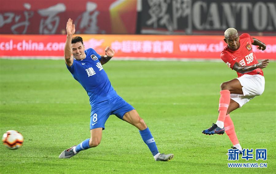 10月27日,广州恒大淘宝队球员塔利斯卡(右)在比赛中射门。 当日,在2019赛季中超联赛第27轮比赛中,广州恒大淘宝队主场以2比2战平河南建业队。 新华社记者 邓华 摄