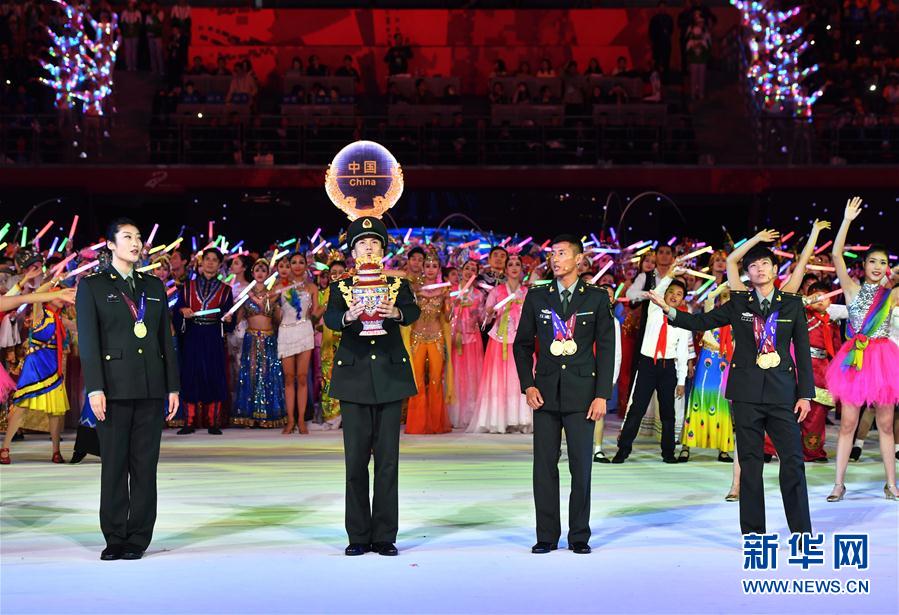 10月27日,在闭幕式上的圣火熄灭仪式上,士兵手捧“和平尊”。 当日,第七届世界军人运动会闭幕式在武汉举行。 新华社记者陈晔华摄