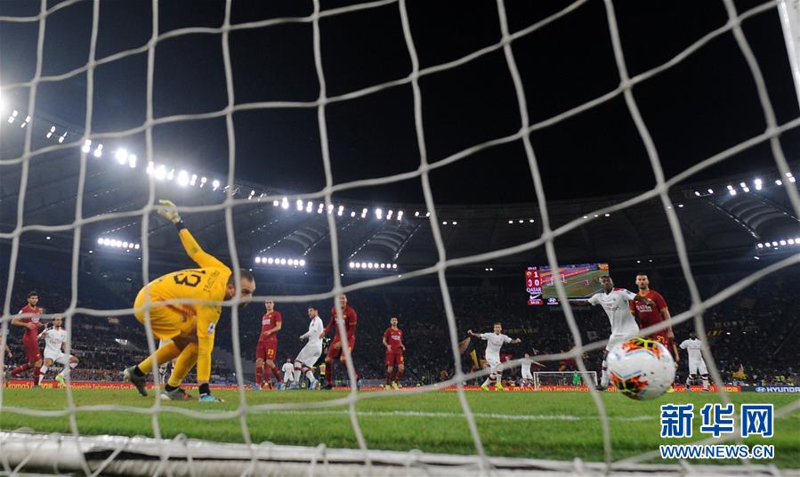 10月27日,AC米兰队球员特奥·埃尔南德斯的进球入网。 当日,在2019-2020赛季意大利足球甲级联赛第九轮比赛中,罗马队主场以2比1战胜AC米兰队。 新华社发(阿尔贝托·林格里亚摄)