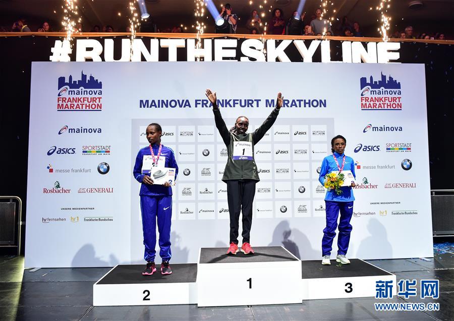 10月27日,女子组冠军肯尼亚选手瓦拉丽·艾乌贝(中)、亚军埃塞俄比亚选手梅格图·凯贝德(左)和季军埃塞俄比亚选手梅斯克雷姆·翁迪马格涅在颁奖仪式上。 当日,第38届法兰克福国际马拉松赛在法兰克福市中心举行。法兰克福是德国举办国际马拉松比赛历史悠久的城市之一,自1981年开始,每年举办一届。 新华社记者 逯阳 摄