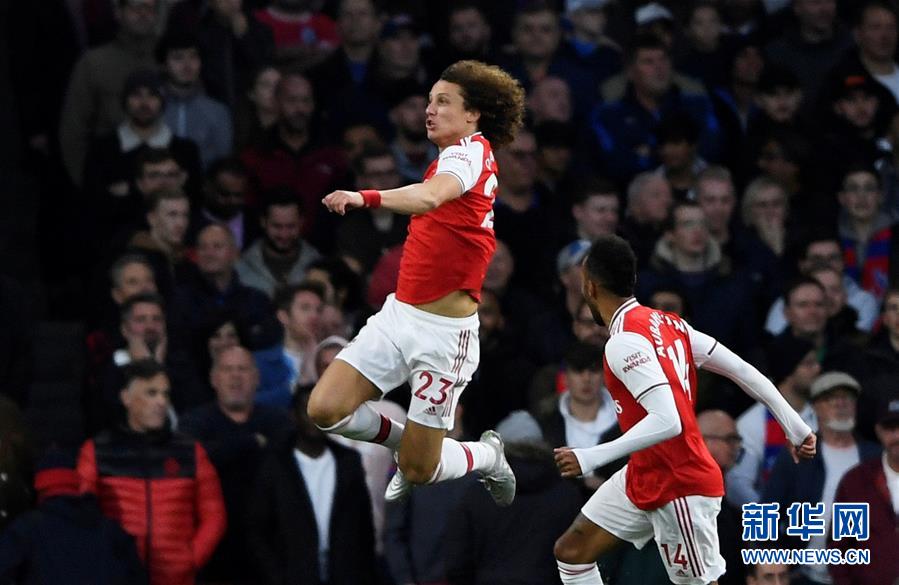 10月27日,阿森纳队球员大卫·路易斯(左)庆祝进球。 当日,在2019-2020赛季英格兰足球超级联赛第10轮比赛中,阿森纳队主场以2比2战平水晶宫队。 新华社/路透