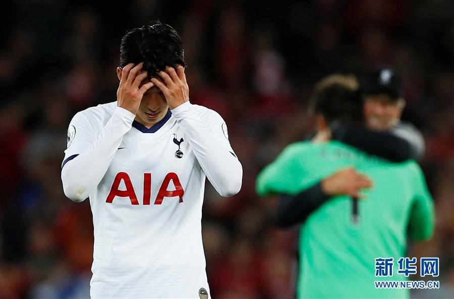 10月27日,托特纳姆热刺队球员孙兴民(左)在比赛失利后。 当日,在2019-2020赛季英格兰足球超级联赛第10轮比赛中,利物浦队主场以2比1战胜托特纳姆热刺队。 新华社/路透