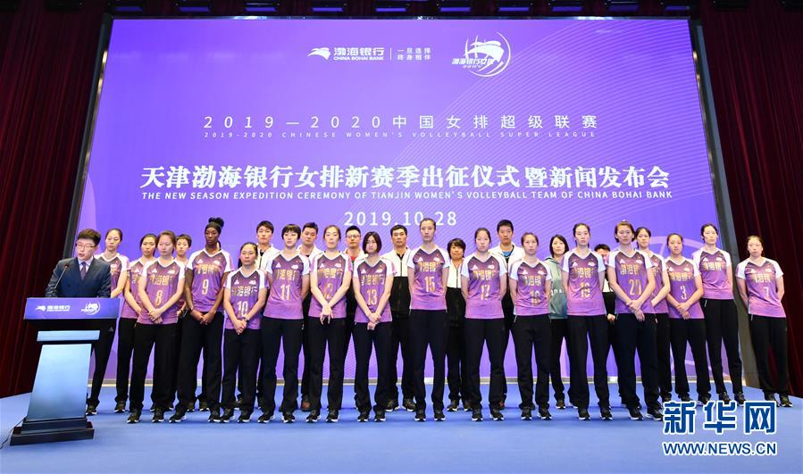 10月28日,天津渤海银行女排在发布会上合影。 当日,2019-2020中国女排超级联赛天津渤海银行女排新赛季出征仪式暨新闻发布会在天津举行。 新华社记者李然摄