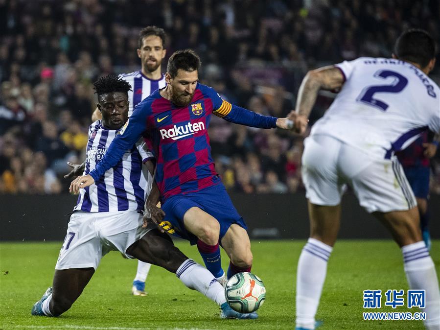 10月29日,巴塞罗那队球员梅西(左三)与巴拉多利德队球员卡里姆(左一)拼抢。 当日,在2019-2020赛季西班牙足球甲级联赛第11轮比赛中,巴塞罗那队主场以5比1战胜巴拉多利德队。 新华社发(胡安·戈萨摄)
