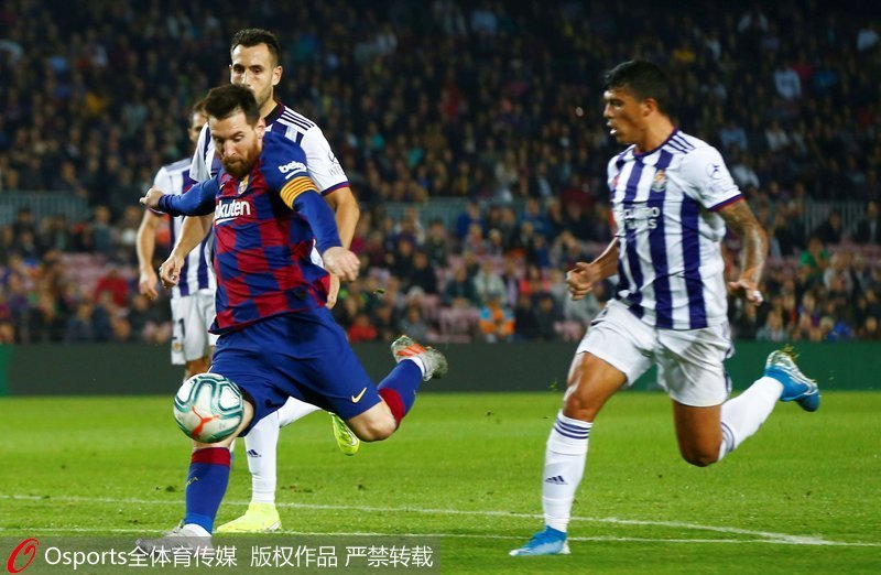 第34分钟,梅西主罚前场右侧任意球,皮球开出后直奔球门右上死角,马西普未能扑到皮球,巴萨3-1巴拉多利德。