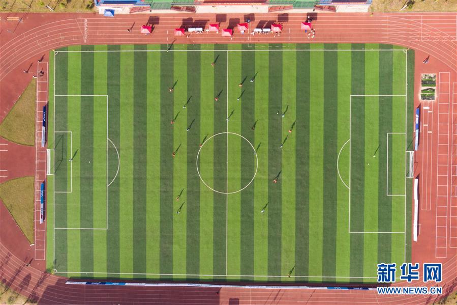 10月31日,海南灵山中学队与山西大学附属中学队在比赛中(无人机拍摄)。 当日,在长沙举行的2019参考消息·萨马兰奇杯中国高中足球锦标赛男子组第6轮比赛中,海南灵山中学队以2比0战胜山西大学附属中学队。 新华社发(陈思汗摄)