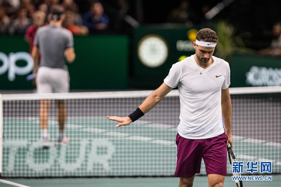 10月31日,保加利亚选手迪米特洛夫(右)在比赛中。 当日,在法国巴黎举行的巴黎网球大师赛男单第三轮比赛中,保加利亚选手迪米特洛夫以2比0战胜奥地利选手蒂姆,晋级下一轮。 新华社发(奥雷利安·莫里萨尔摄)