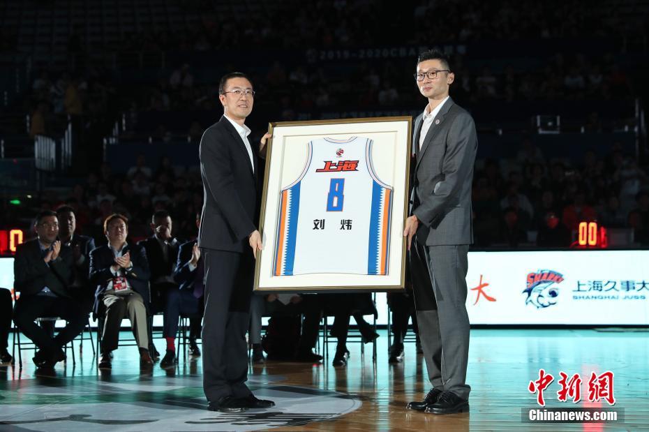 11月2日,上海男篮在CBA新赛季首场比赛开赛前,为球队传奇后卫刘炜举行了退役仪式,并将他的8号球衣永久封存。中国篮协主席姚明也专程赶来,并为刘炜颁发了“中国篮球之队磐石奖”。图为刘炜球衣封存仪式。中新社记者 张亨伟 摄