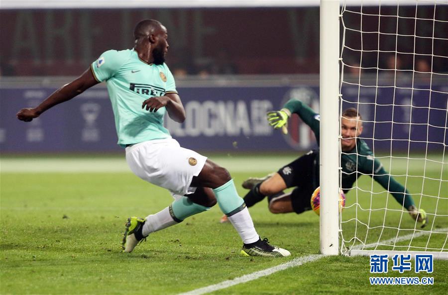 11月2日,国际米兰队球员卢卡库(左)攻门得分。 当日,在2019-2020赛季意大利足球甲级联赛第11轮比赛中,国际米兰队客场以2比1战胜博洛尼亚队。 新华社/美联