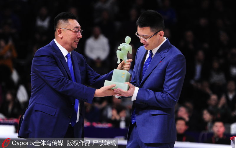 俱乐部负责人向杨鸣颁发了水晶纪念杯和水晶鼎