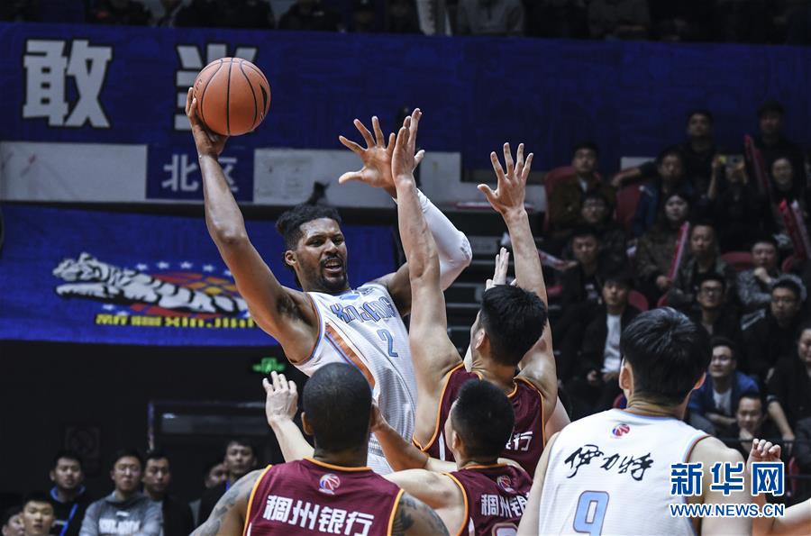 11月5日,新疆伊力特队球员斯托克斯(上)在比赛中进攻。 当日,在2019-2020赛季中国男子篮球职业联赛(CBA)常规赛第二轮比赛中,新疆伊力特队主场以146比138战胜浙江稠州银行队。 新华社记者王菲摄