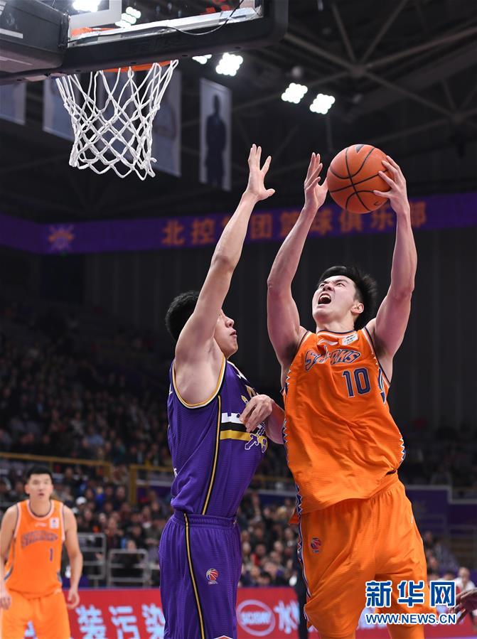 11月5日,上海久事队球员董瀚麟(右)在比赛中持球进攻。 当日,在2019-2020赛季中国男子篮球职业联赛(CBA)常规赛第二轮比赛中,北京控股队主场以98比102不敌上海久事队。 新华社发(任超摄)