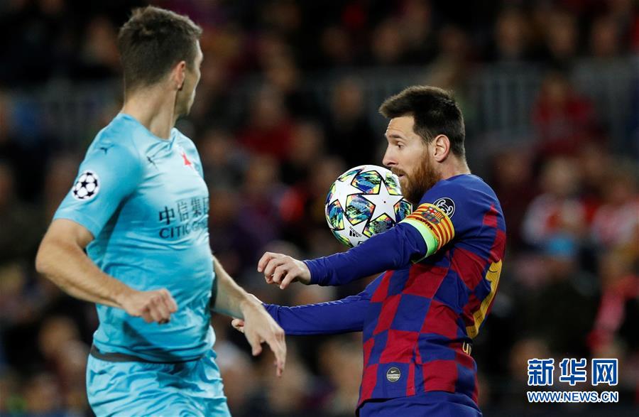 11月5日,巴塞罗那队球员梅西(右)在比赛中停球。 当日,在2019-2020赛季欧洲足球冠军联赛F组比赛中,西班牙巴塞罗那队主场以0比0战平捷克布拉格斯拉维亚队。 新华社/路透