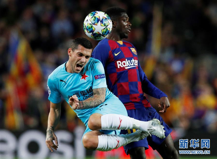 11月5日,巴塞罗那队球员登贝莱(右)在比赛中和布拉格斯拉维亚队球员斯坦丘拼抢。 当日,在2019-2020赛季欧洲足球冠军联赛F组比赛中,西班牙巴塞罗那队主场以0比0战平捷克布拉格斯拉维亚队。 新华社/路透