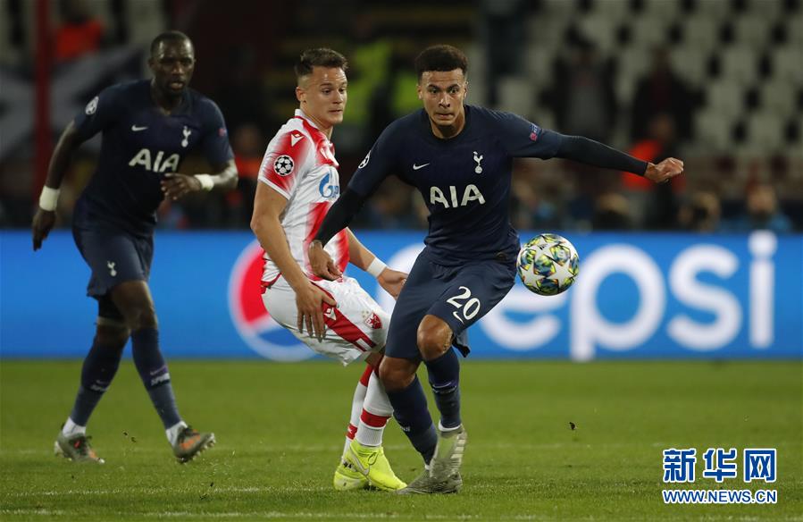 11月6日,热刺队球员阿里(右)在比赛中和贝尔格莱德红星队球员彼得罗维奇拼抢。 当日,在2019-2020赛季欧洲足球冠军联赛B组比赛中,英超托特纳姆热刺队客场以4比0战胜塞尔维亚贝尔格莱德红星队。 新华社发(普雷德拉格·米洛萨夫列维奇摄)