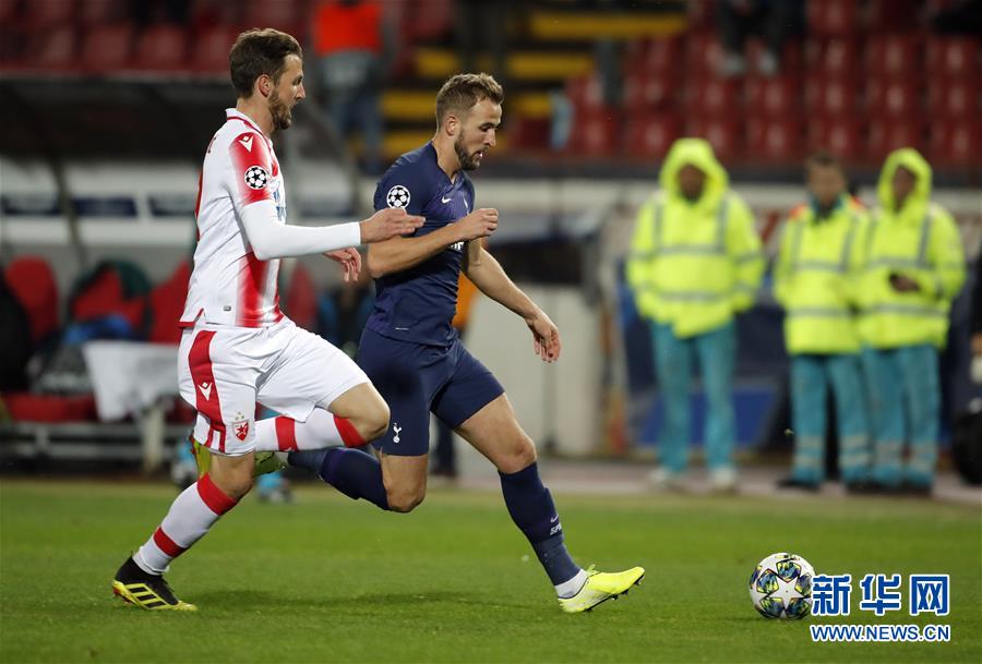11月6日,热刺队球员凯恩(右)在比赛中和贝尔格莱德红星队球员米卢诺维奇拼抢。 当日,在2019-2020赛季欧洲足球冠军联赛B组比赛中,英超托特纳姆热刺队客场以4比0战胜塞尔维亚贝尔格莱德红星队。 新华社发(普雷德拉格·米洛萨夫列维奇摄)